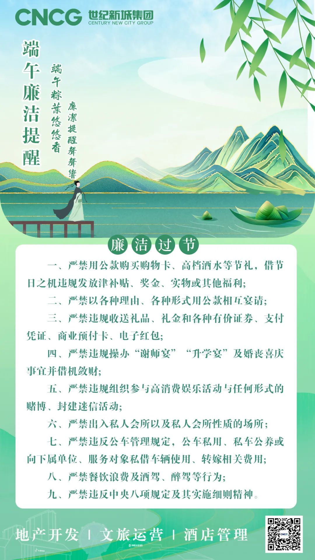 端午粽葉悠悠香,廉潔提醒聲聲響。假日風(fēng)光無(wú)限好,各項(xiàng)禁忌要記牢。端午將至,為進(jìn)一步貫徹落實(shí)中央八項(xiàng)規(guī)定精神,持續(xù)糾治“四風(fēng)”,凈化節(jié)日風(fēng)氣,江蘇世紀(jì)新城集團(tuán)紀(jì)委提醒您: