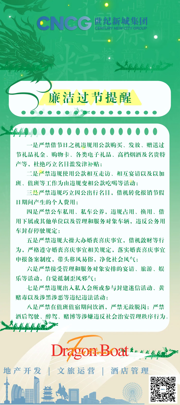 端午臨中夏,時(shí)清日復(fù)長(zhǎng)。一年一度端陽(yáng)日,廉潔自律記心間,世紀(jì)新城集團(tuán)紀(jì)委提醒廣大干部職工,節(jié)日期間不忘堅(jiān)守紀(jì)律“底線”,不碰紀(jì)律“紅線”,做到風(fēng)清氣正迎仲夏,“粽”享廉潔端午節(jié)。