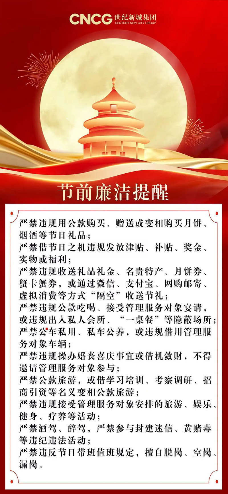 清風(fēng)伴佳節(jié),廉潔守初心,2025年國慶、中秋“雙節(jié)”將至,為持續(xù)推進作風(fēng)建設(shè)常態(tài)化長效化,馳而不息糾“四風(fēng)”樹新風(fēng),營造風(fēng)清氣正的節(jié)日氛圍,世紀新城集團紀委提醒全體黨員干部職工:守紀律、明底線、知敬畏,時刻繃緊紀律規(guī)矩這根弦,讓節(jié)日清風(fēng)常駐、正氣長存。