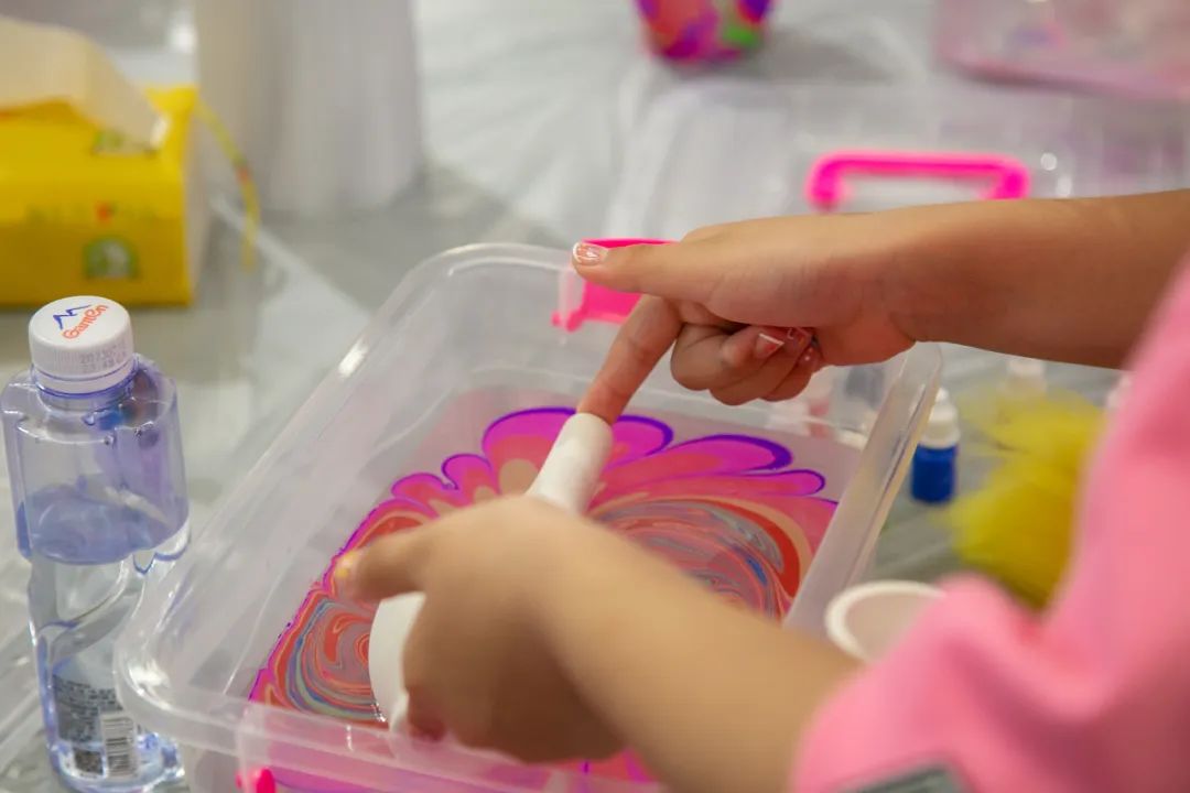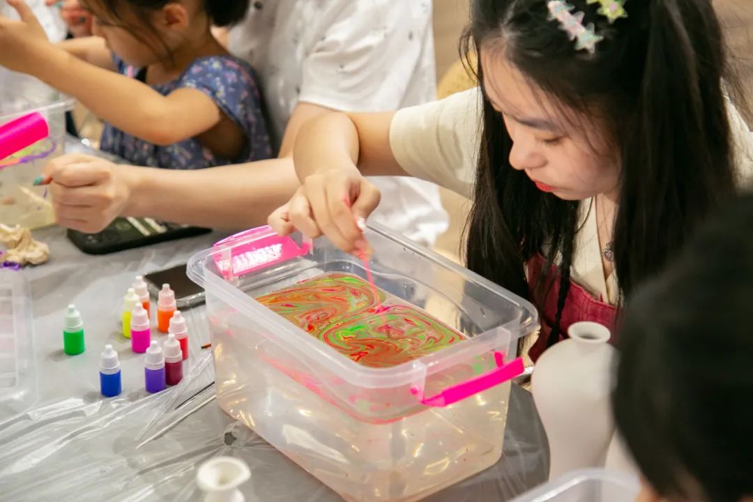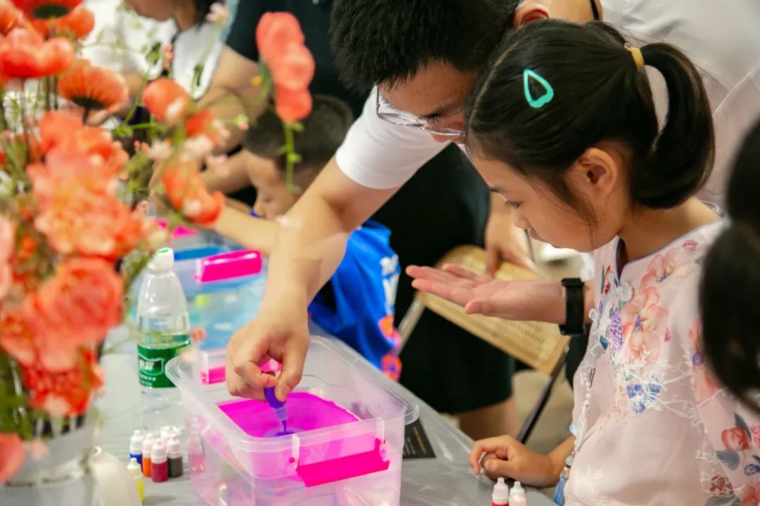 活動現(xiàn)場,志愿者向大家介紹水拓畫和水拓花瓶的知識并進行演示制作,30組家庭在志愿者的指導(dǎo)下動手制作,倒水、挑色、作畫、覆瓶,在輕松歡樂的氛圍中,一幅幅色彩斑斕的水拓畫浮于水面,一只只獨一無二的水拓花瓶立于臺上。孩子們在活動中學(xué)習(xí)并感受水拓技術(shù)的魅力,進一步激發(fā)了創(chuàng)造力和想象力,也促進了親子間的互動與協(xié)作,讓成長更有“溫度”。