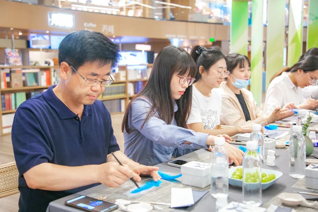 平穩(wěn)的案板,端方的紙筆,精細的工具,大家在歡聲笑語中,邊學(xué)邊做邊交流,描、剪、填、粘、鑲......每個步驟都大家全神貫注、小心翼翼、精益求精,好像一位位技藝嫻熟的工匠。不一會兒,巧手“工匠”們精心制作的點翠胸針就完成了,在紛繁復(fù)雜的工藝之下,一件件精美的作品宛若一只只翩然起舞的藍蝶、展翅欲飛的青鳥,凝結(jié)著大家勞動的愉悅和美的創(chuàng)造,大家在完成作品的同時,對傳統(tǒng)非遺文化點翠技藝也有了更深的感知。