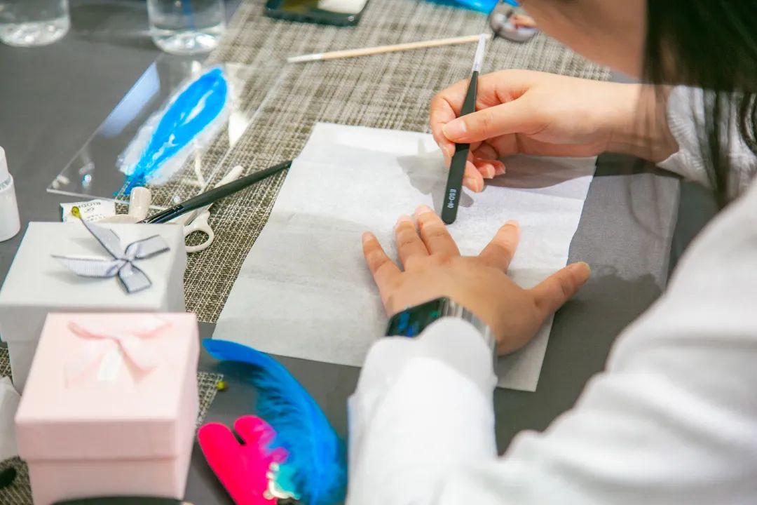 點翠工藝,是一項產(chǎn)生自漢代的中國傳統(tǒng)的金銀首飾制作工藝,它是首飾制作中的一個輔助工種,起著點綴美化金銀首飾的作用。指導(dǎo)老師和大家分享了關(guān)于點翠工藝的故事,以及現(xiàn)代如何運用染色羽毛代替翠鳥毛進行點翠工藝的仿制。指導(dǎo)老師一邊與大家講解關(guān)于點翠胸針的制作技巧,一邊按照步驟示范制作過程。
