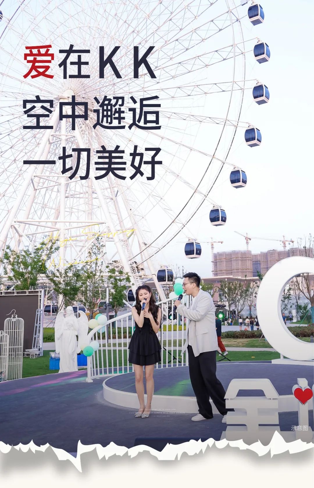 明媚的陽光下,摩天輪載著滿滿的期待旋轉(zhuǎn)向上,抬頭就是遼闊的天空,低眼就是草坪、湖景。小小轎廂內(nèi)愛意滋生,空中邂逅的愛情,值得一輩子紀(jì)念。