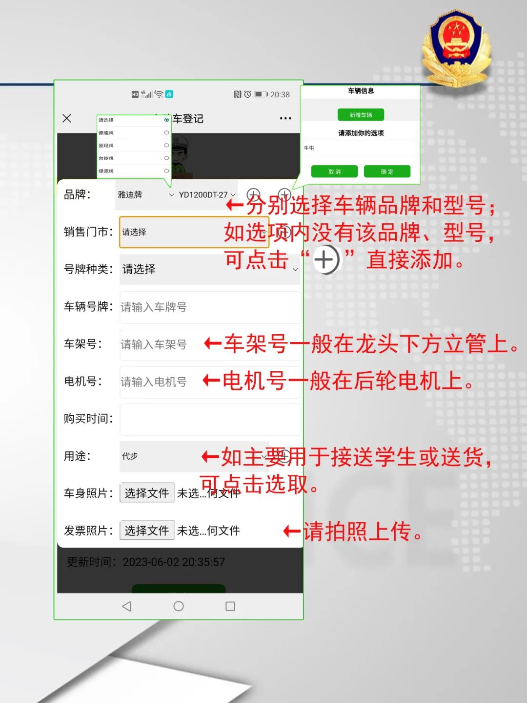 第3步:按照要求,填寫車輛品牌和型號(hào);選擇“銷售門市、號(hào)牌種類”,輸入車輛號(hào)牌、車架號(hào)、電機(jī)號(hào),以及購(gòu)買時(shí)間、用途,最后選擇上傳車身照片以及購(gòu)車發(fā)票。