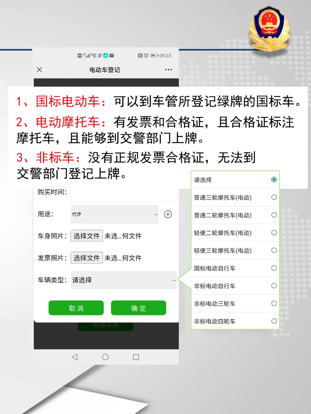 為有效預(yù)防和減少電動(dòng)車道路交通事故,維護(hù)道路交通秩序,保護(hù)人民群眾生命財(cái)產(chǎn)安全,當(dāng)前全市范圍內(nèi)正在開(kāi)展電動(dòng)車普查登記,登記范圍包括電動(dòng)二、三、四輪車和電動(dòng)摩托車。民警、村干部、網(wǎng)格員、志愿者等每天走訪入戶開(kāi)展相關(guān)工作,請(qǐng)大家予以理解與配合。大家還可以自主選擇網(wǎng)上登記,省時(shí)省力更省心。