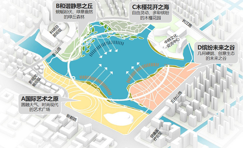 以創(chuàng)意生態(tài)、活力體驗(yàn)、繽紛魅力的格調(diào)為主,突出創(chuàng)意體驗(yàn)、活力現(xiàn)代等特色,主要建設(shè)創(chuàng)意水岸、藝術(shù)山谷、綠坡花園等。