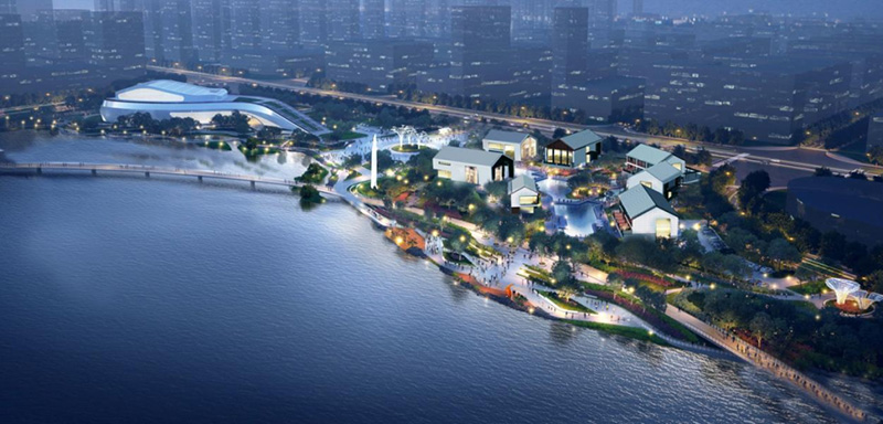 對接中韓文化客廳和周邊城市功能,分區(qū)以時(shí)尚現(xiàn)代、大氣開敞為主題格調(diào),突出文化、藝術(shù)、休閑等主題功能,主要建設(shè)為文化水岸、藝術(shù)廣場等。