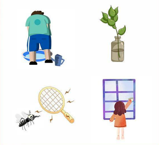 清除各種積水和積水容器,水培植物每隔七天換水洗瓶,控制蚊蟲孳生,房間適時安裝紗門紗窗。
