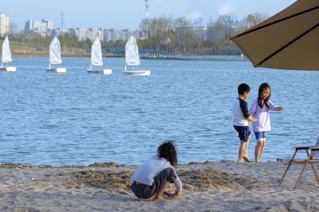 寫湖畔沙灘上,孩子們一起挖沙、筑堡,