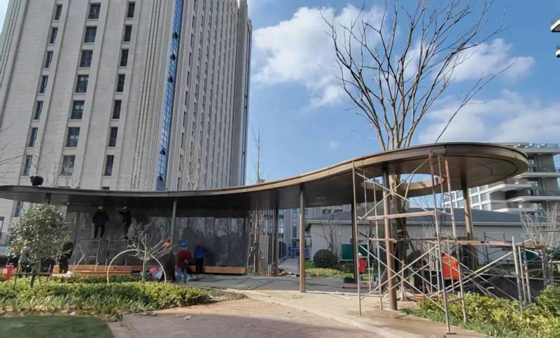 路面瀝青、PC磚、透水混凝土、塑膠運動場地已全部完成,工人精心裁剪、多點交匯的設計堪稱藝術;廊架正在進行最后的嚴格標準化安裝,確保結構穩(wěn)固、焊縫嚴絲合縫。