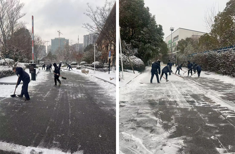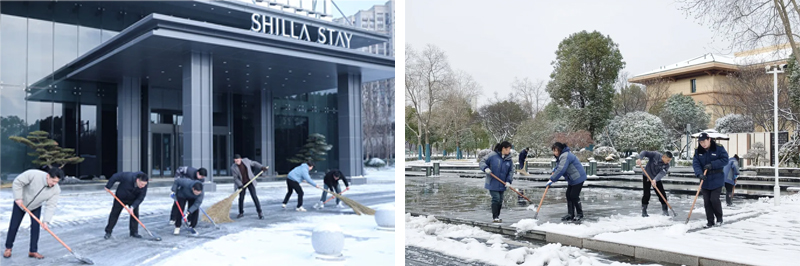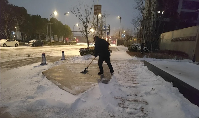 寒潮突至,降雪來襲,道路積雪結(jié)冰給住客出行帶來諸多不便與安全隱患。為全力保障住客出行安全,酒店公司迅速響應(yīng),全體員工聞令而動(dòng),不畏凜冽寒風(fēng),滿懷熱忱投入到清雪除冰工作中。