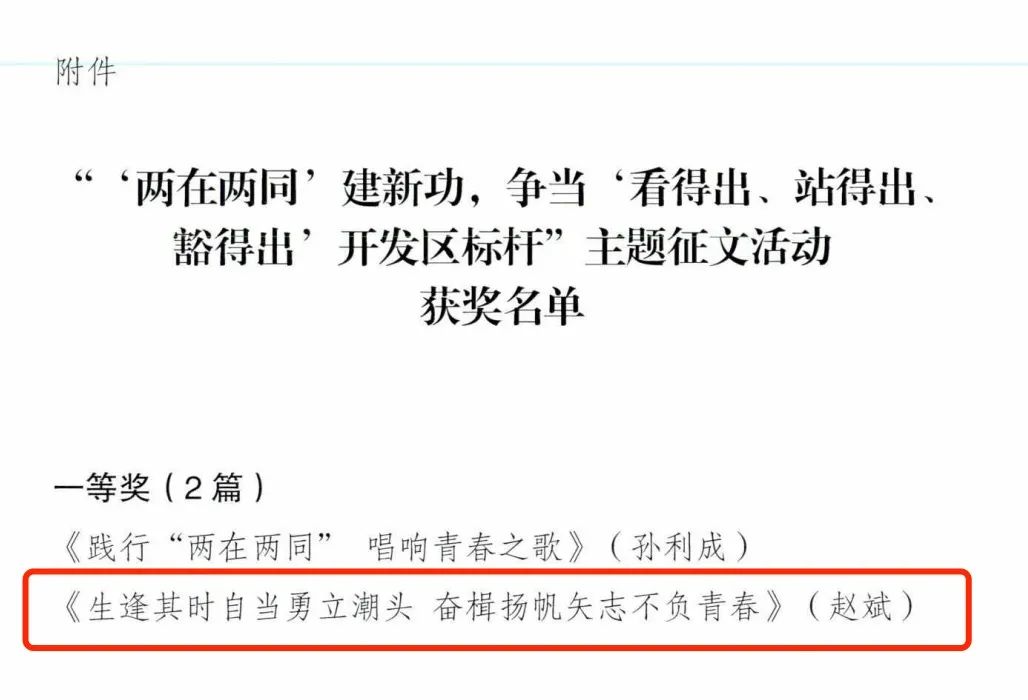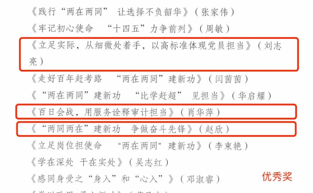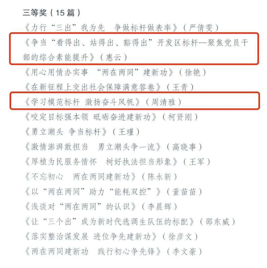 本次獲獎作品中:集團紀委趙斌作品《生逢其時自當勇立潮頭奮揖揚帆矢志不負青春》榮獲一等獎,地產公司惠云作品《爭當“看得出、站得出、豁得出”開發(fā)區(qū)標桿一聚焦黨員干部的綜合素能提升》、融資部周清雅作品《學習模范標桿激揚奮斗風帆》榮獲三等獎,審計部肖華萍作品《百日會戰(zhàn),用服務論釋審計擔當》、財務部劉志亮作品《立足實際,從細微處著手,以高標準體現(xiàn)黨員擔當》、招標部趙欣作品《“兩同兩在”建新功,爭做奮斗先鋒》榮獲優(yōu)秀獎。